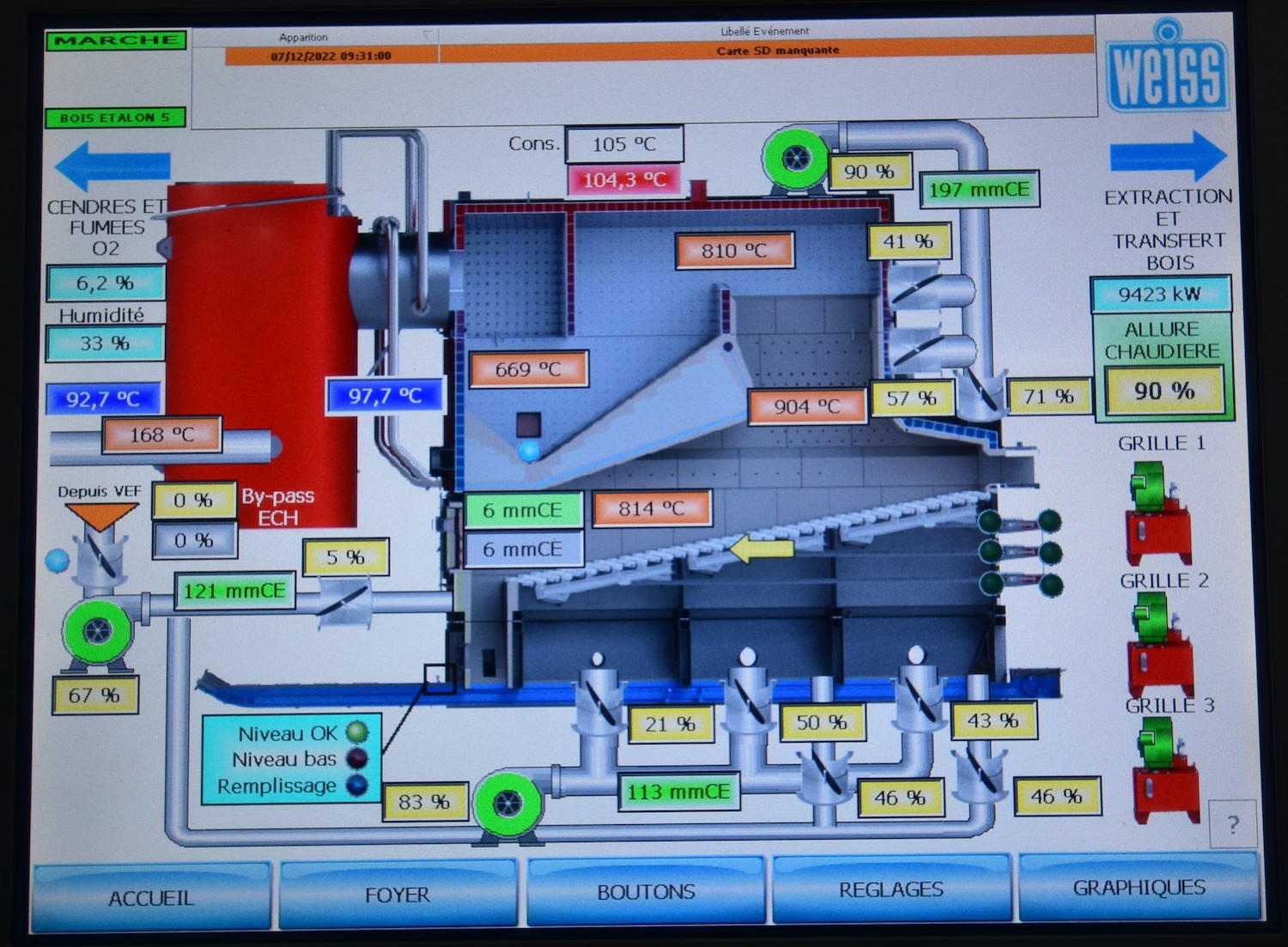 La chaudière biomasse consomme des bois jusqu’à 55 % d’humidité et est utilisée ici uniquement durant la période de chauffe, du 1er octobre au 31 mai. L’ensemble de la chaufferie et du réseau de chaleur fonctionne par roulement avec 4 techniciens, 1 contremaître et 1 cadre.