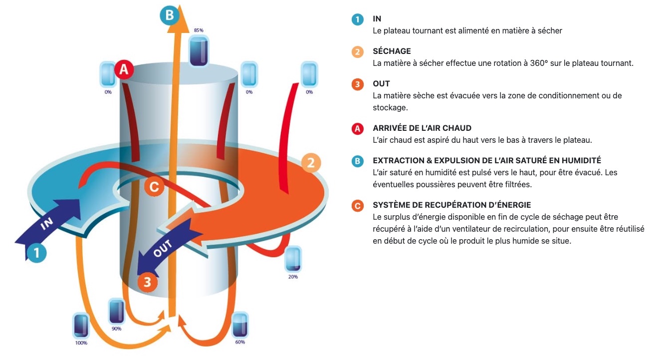 Le modèle installé à La Roche-en-Brenil est un Dryer One™ Simple Disque qui permet le séchage avec de l’air à basse température et lorsque le volume d’eau à évaporer n’est pas trop important. La matière à sécher est répartie sur un disque rotatif traversé par un flux d’air chaud ici en provenance des chaudières.
