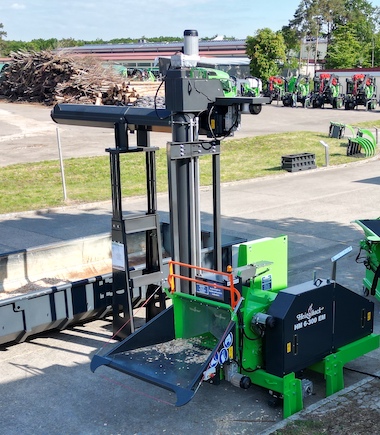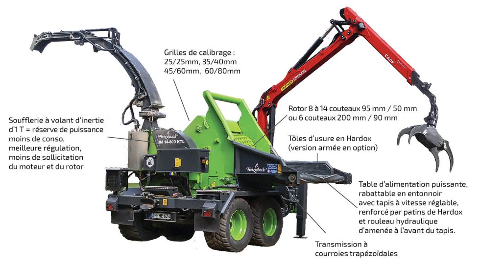 La série HM 8-400 Green Serie, à destination des entreprises du paysage, évolue pour produire des plaquettes plus grosses et utilisables en chaufferies grâce à un rotor à 4 couteaux au lieu de 8 ; avec un crible supplémentaire sous le couvercle du rotor ; avec une pompe hydraulique plus forte pour une vitesse d’alimentation plus rapide mais une vitesse de rotor plus lente ; avec 4 pales d’éjection au lieu de 2, indispensable pour une vitesse de rotor plus lente ; avec une commande électrique différente de celle de l’alimentation du broyeur ; et avec une nouvelle table d’alimentation avec cordon sécurisé.