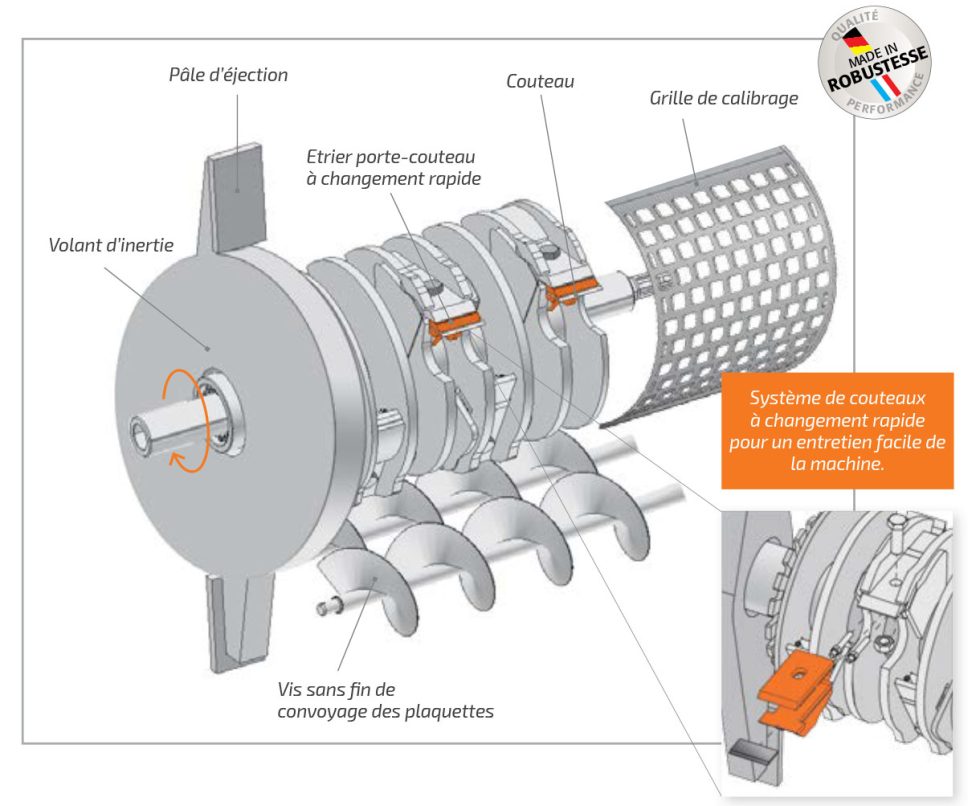 Déchiqueteuse stationnaire électrique sans éjection et sortie par vis, photo Frédéric Douard