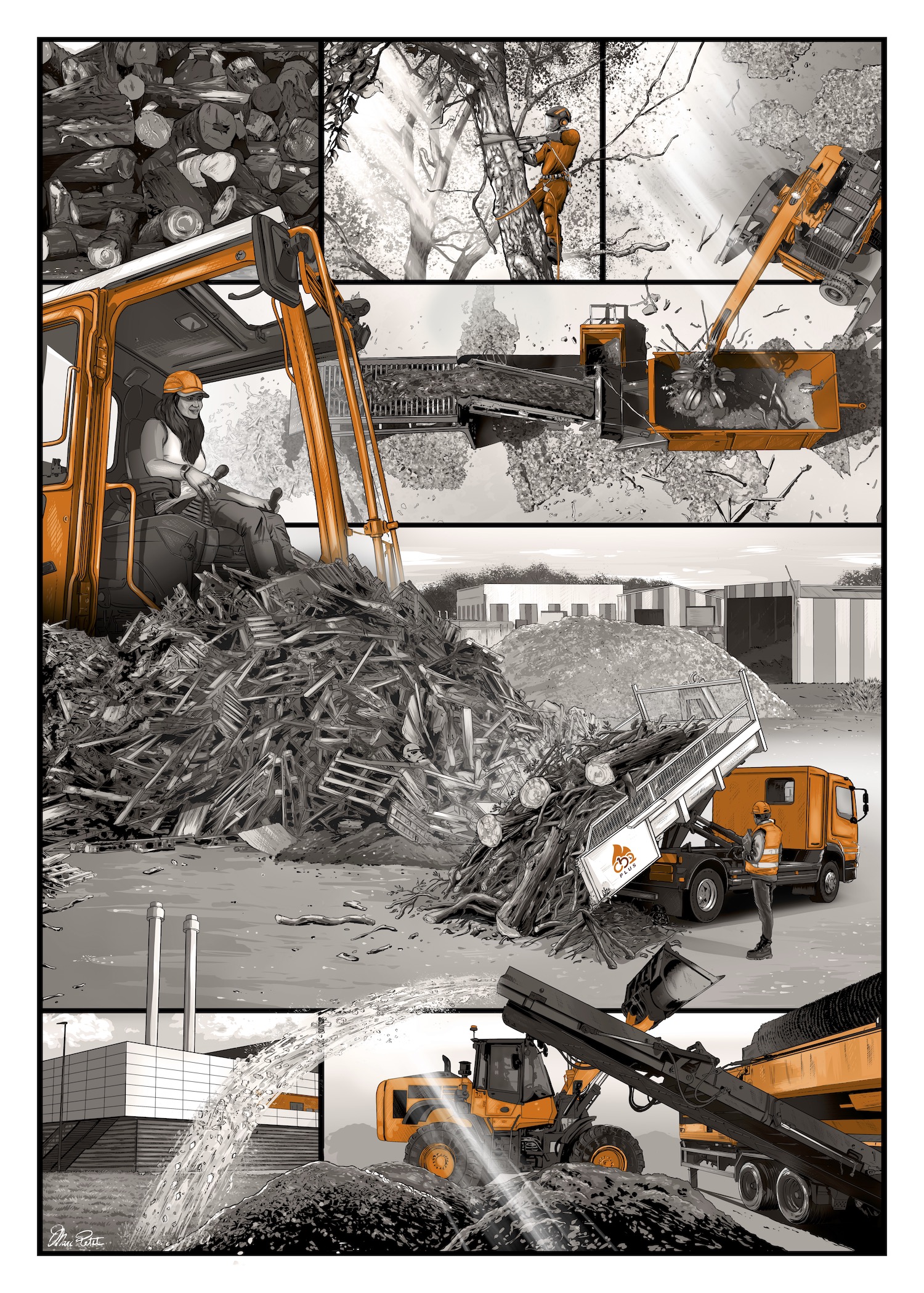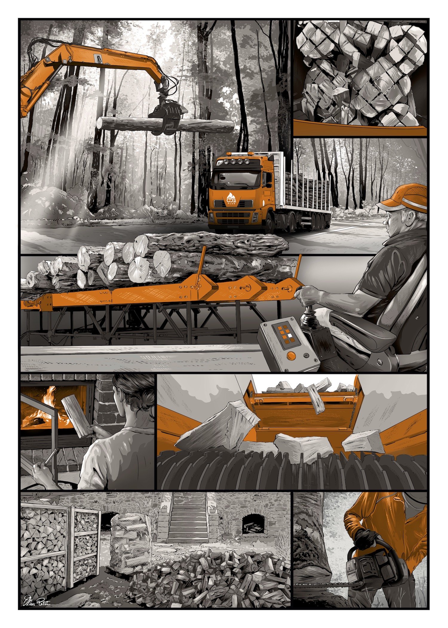 Le premier moment a dévoilé trois superbes œuvres artistiques, des planches de dessins originaux exécutés par Marc Petit sur trois secteurs d’activités des professionnels CBQ+ : le bois déchiqueté, bûche et de recyclage. Une quatrième planche sortira à l’automne sur le granulé de bois. Ces œuvres que nous publions aujourd’hui pour la première fois sont à la fois remarquables par leur qualité, mais également suffisamment rares pour les saluer.