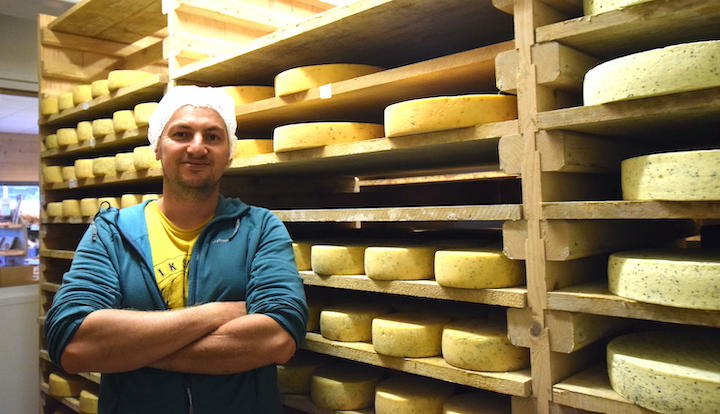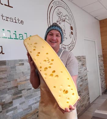 Benjamin Hess avec une demi-meule d’emmental, photo Pré Verdot