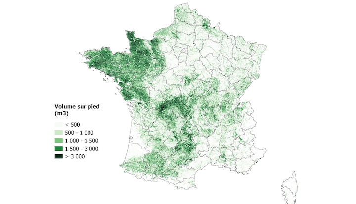 Carte des stocks de bois bocager sur pied par km²