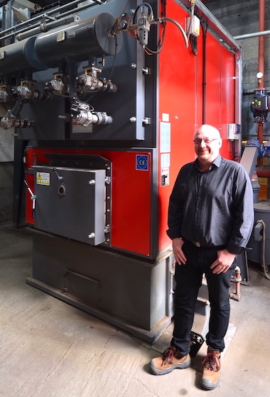 Koen Clepkens devant la chaudière Uniconfort de la menuiserie CMT à Dentergem, photo Frédéric Douard