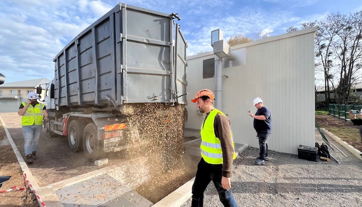 Première livraison de bois à la chaufferie de Châteaumeillant, photo SDE18