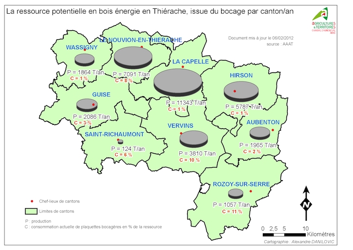 Le potentiel de la ressource bocagère est donc d’environ 35 à 38 000 tonnes / an, ce qui permettrait d’alimenter 1500 chaudières de 50 kW et de chauffer de 15 000 à 18 000 personnes. Cette ressource est inégalement répartie sur le territoire : les cantons limitrophes de l’Avesnois, de Wallonie et des Ardennes ont un potentiel de production supérieur.