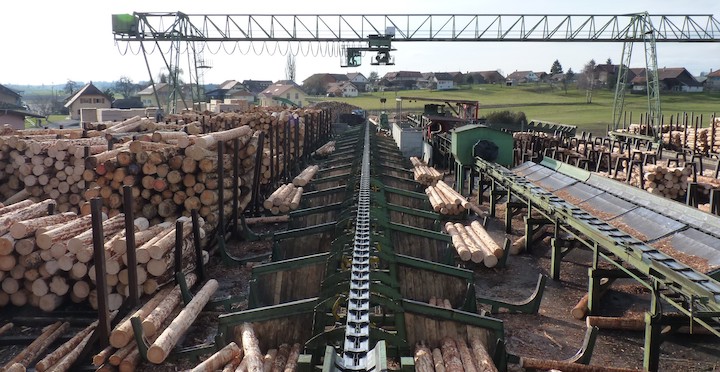 Chaîne d’arrivage et de tri des grumes écorcées à la scierie, photo Frédéric Douard