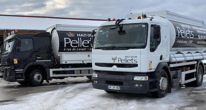 Deux des trois camions souffleurs de Haut-Doubs Pellets, photo HDP